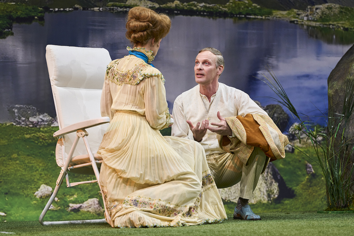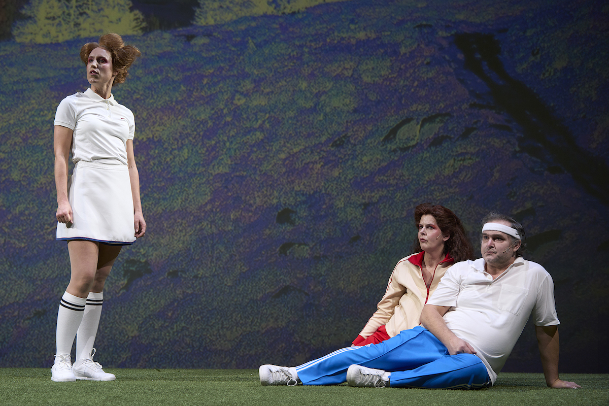Auch Sergej Bassow (Jan Bluthardt) zeigt sich vor dem zu Paramount-Picture-Schönheit aufgepimpten Berggipfel gleich in all seiner erbärmlichen Bigotterie. Hat er doch die Sommergäste zu einer Digital-Detox-Kur nach Davos geladen, bei der jedoch nicht nur im Arbeitsraum, sondern auch hinter jedem Busch ein Smartphone oder Notebook liegt. Seiner Frau Warwara (Annika Meier) passt das nicht, weil sie wirklich mal eine Pause will.