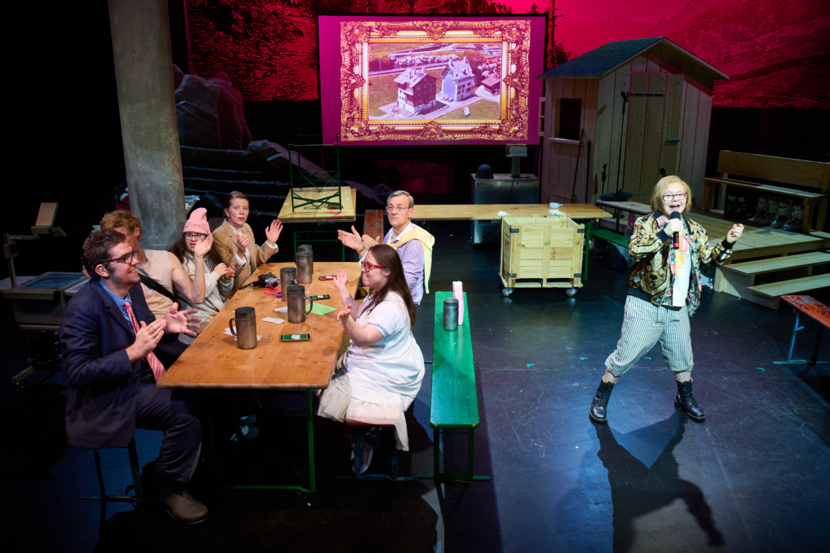 Die "Vollversammlung" im Theater St.Gallen beginnt harmlos wie eine dieser vielen steifen Dorf-Anlässe. Und dreht dann gleich ab ins überhöht Absurde. Zu lüpfiger Ländlermusik und Juchzern werden Bierhumpen gefüllt; Konfusion, wer darf bei wem an den Festgarnituren Platz nehmen, "Humpa Humpa" und wilde Dance-Moves, zuvor hatte der "Jungmusik-Präsident und Presseverantwortliche" eine ausufernde Ansprache gehalten, das Publikum stimmte über das vorgezogene Protokoll ab, die Sponsoring-Verantwortliche verhedderte sich in den Folien für den Overhead-Projektor – lokalpolitischer Versammlungswahnsinn auf die Spitze getrieben.