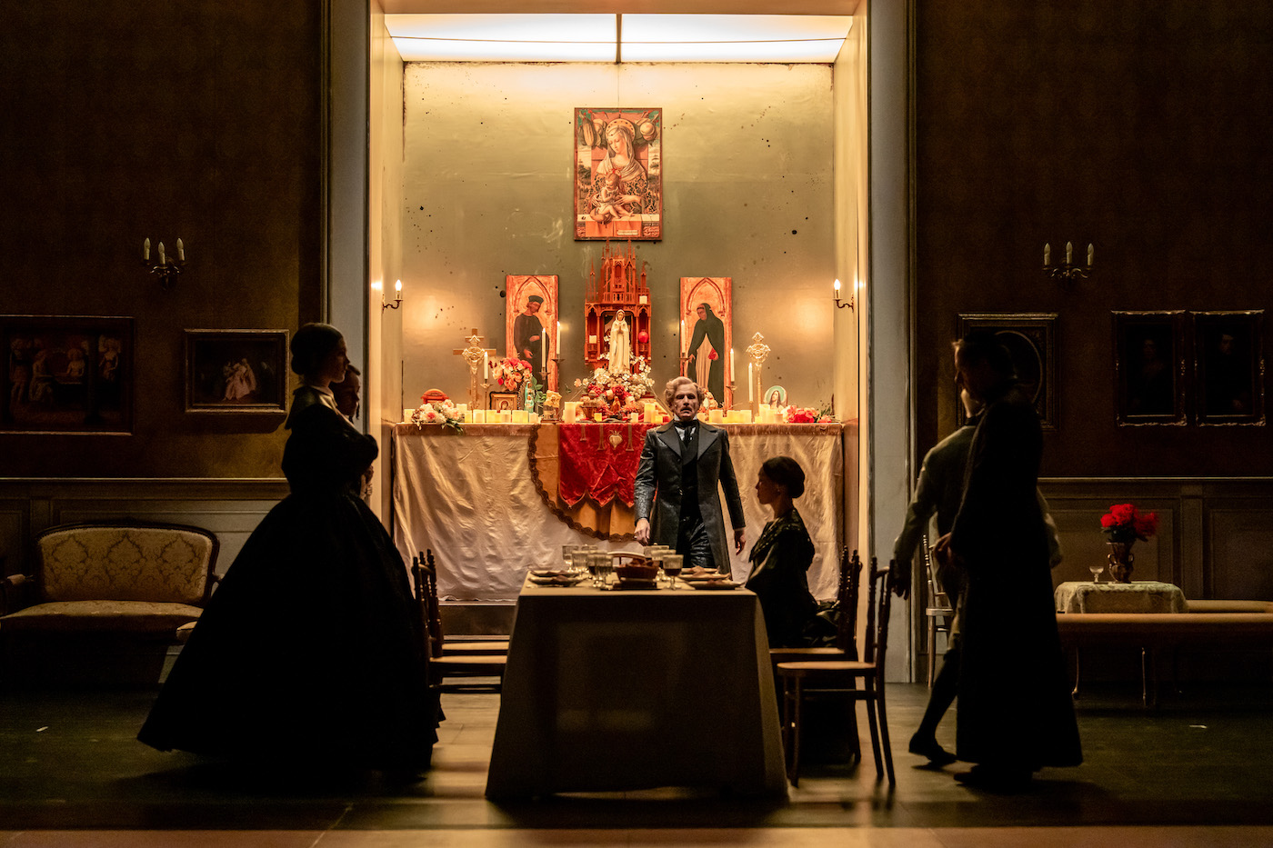 Tomasi war selber Abkömmling dieses Adels, und in der Schiffbauhalle des Schauspielhauses Zürich erstehen die Paläste seines Umfelds nochmals neu. Michela Flück hat die Tribüne gedreht, das Publikum schreitet durch die Flucht von Palasträumen und nach der Pause am Buffet des Balles vorbei zu seinen Plätzen. Vorne der Salon, hinter dem ersten Portal das Vorzimmer oder hereingeschobene Bad oder Büro. Quasi in der zweiten Gasse dann der treibhausartige Garten und die Kapelle, und noch eine Schicht dahinter ein rot ausgeschlagener Korridor mit abgehenden Türen.