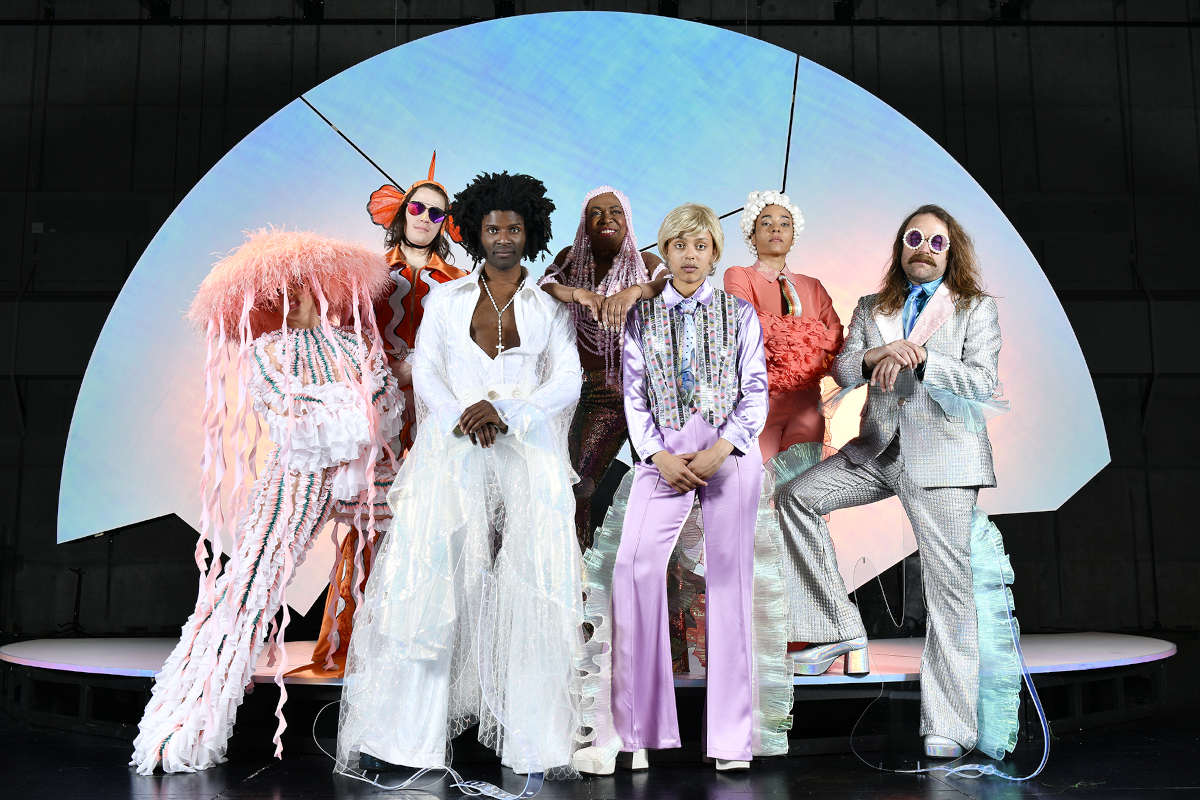 Die Crew im Meerjungfrauen-Look: Sophie Yukiko, Vincent Basse, Emeka* Ene, Lori Glori, Yèinou Avignon, Sasha Melroch und Lukas Vögler in Kostümen von Nadine Bakota © Zoé Aubry
