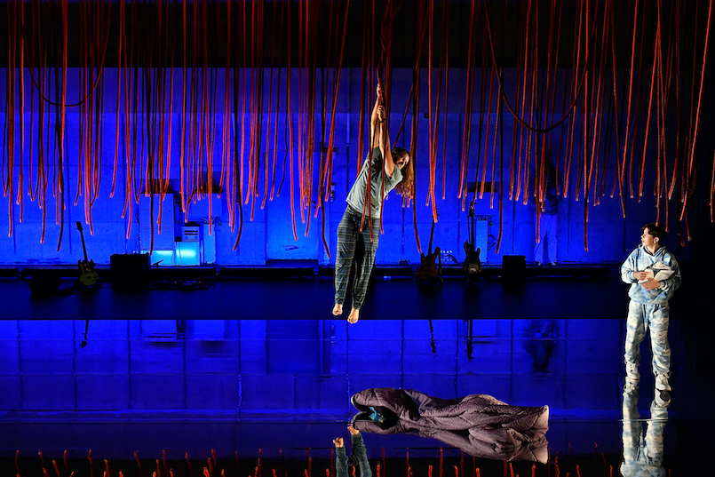 Wie ein Sinnbild für die erlernte emotionale Verstocktheit hängen auf der Bühne rote Seile von der Gitterdecke. Diese fährt immer wieder hoch und runter. Wer unten zwischen den Seilen durchmuss, muss sich ein wenig winden. Oben auf dem Gitterdach ist es freier.