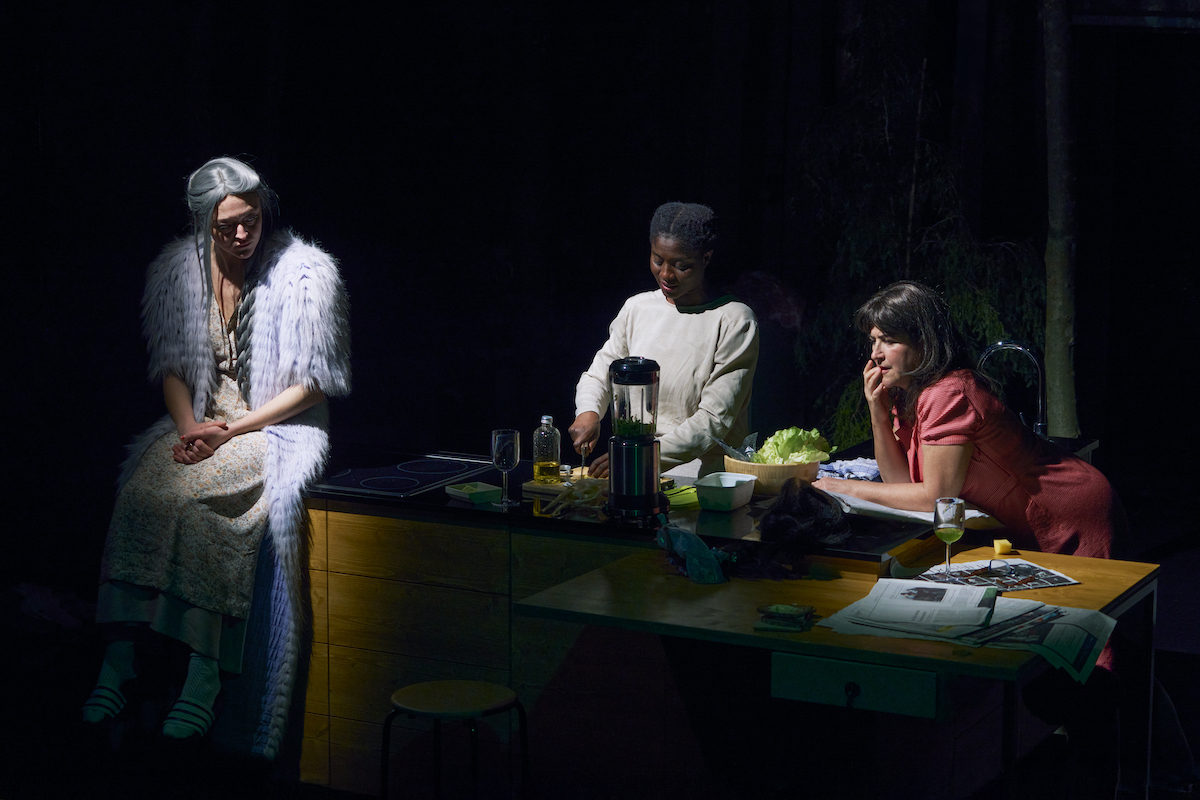 Maria Milisavljević hat ihrem Text "Staubfrau" den Untertitel "Ein Theatertext für eine oder mehrere Frauen*" gegeben. In Zürich lassen drei beeindruckende Spieler:innen ihre Rollen ineinanderwuchern wie das Grünzeug in Thurid Peines Bühnenbild. Pflanzkübel stehen im Hintergrund der schicken Küchenausstattung samt Mixer und Waschmaschine. Zuerst drängen sie sich sprachlich in den Vordergrund, wenn ein Stimmengewirr immer wieder vom "Kräutergarten" berichtet, in dem die "Beerenbüsche" zwischen "buntblühenden Topfpflanzen" wachsen. Später werden sie in der Femizid-Szene die Bühne überwuchern.