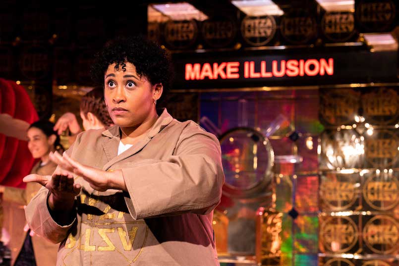 Düstere Stimmung in der funkelnden Servicewelt: Mara Widmann (im Vordergrund) auf der Bühne von Mai Gogishvili © Cristiano Remo