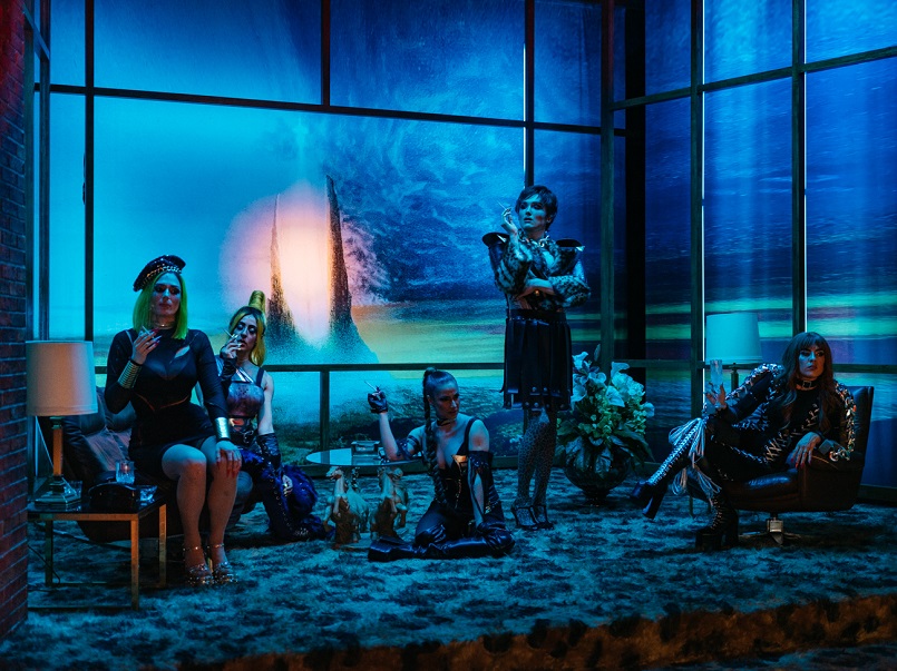 12. Mai 2023. Die Damen tragen Lack-Harness und weit ausgeschnittene Bademantelroben, dazu auch mal einen skythischen Papp-Helm oder Pfeil und Bogen. Die Bühne zieht sich von einem wüstenroten Horizont der Zerstörung, der ganz im Hintergrund durch die Panoramafenster eines neureichen Livingrooms grad noch knapp zu erkennen ist, über eine kurze Showtreppe zu einem Glitter-, Glanz- und Glamour-Geviert, das je nach Bedarf als Laufsteg oder als Wrestlingmatte dient.
