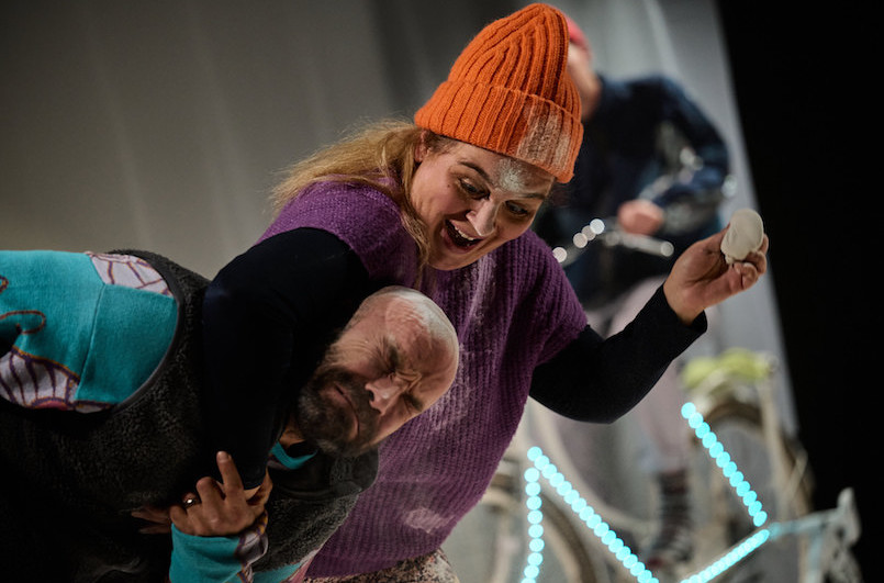 Köln, 2. März 2018. "Vorstands-Christian hat geschrieben, dass er nicht zum Elternabend kommen kann, weil er sich den Bizeps gerissen hat. Den Bizeps, ey", sagt eine Frauenstimme, "wie reisst man sich denn den Bizeps?" Die Stimme gehört Philine Velhagen, das zustimmende Schmatzen im Hintergrund gehört zu ihrem Freund, und der Esstisch auf der Bühne des Freien Werkstatt Theaters gehört eigentlich in ihrer beider Wohnung. Jetzt sitzt Publikum um ihn herum und lauscht aus Kopfhörern dem Gespräch, das sich vor ziemlich genau einem Jahr ereignet hat: Welcher war noch mal der Bizeps, tut das arg weh, und was ist Vorstands-Christian eigentlich für einer?