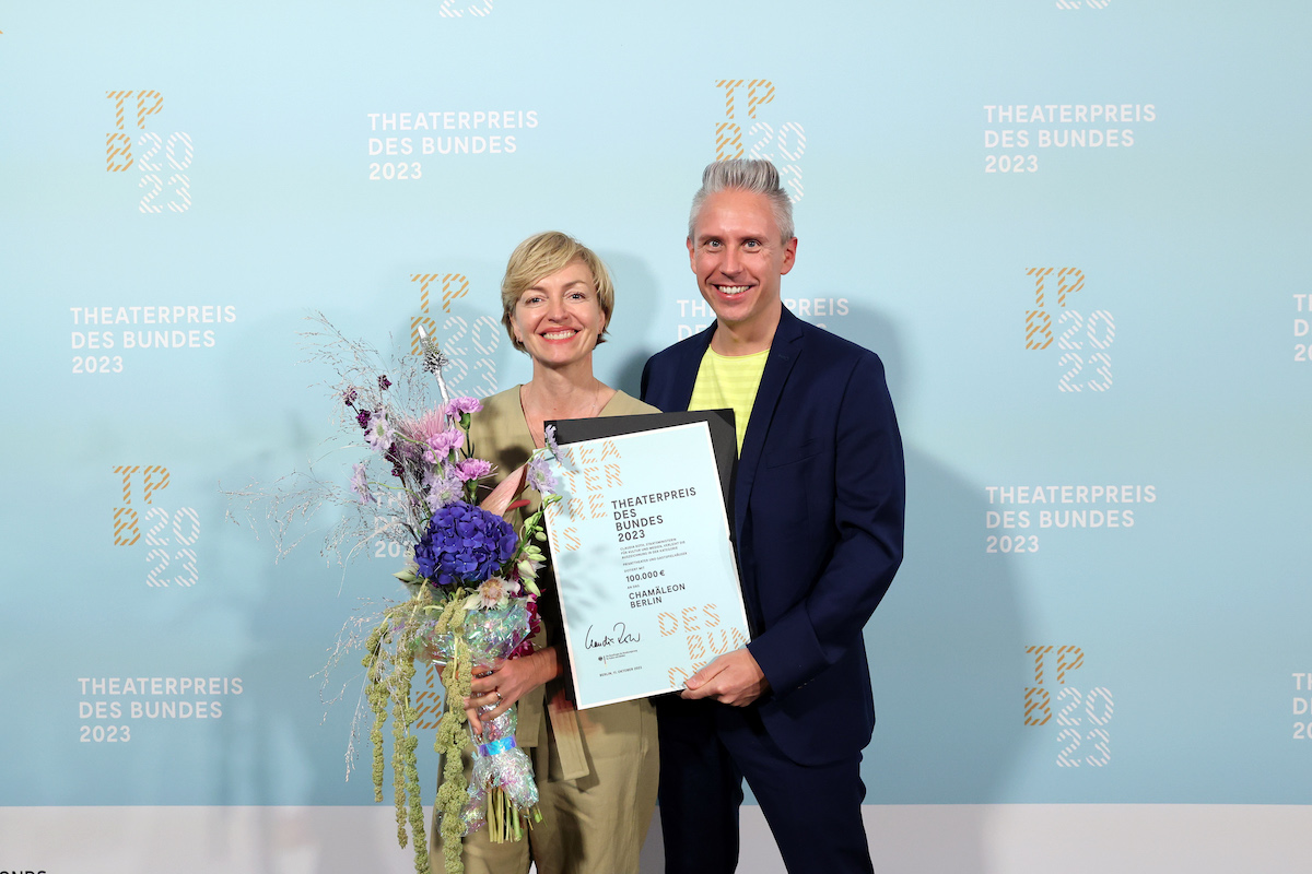 Ausgezeichnete Visionäre: Intendantin Anke Politz und Geschäftsführer Hendrik Frobel nehmen den Theaterpreis des Bundes 2023 in der Kategorie Privattheater und Gastspielhäuser entgegen © Dorothea Tuch