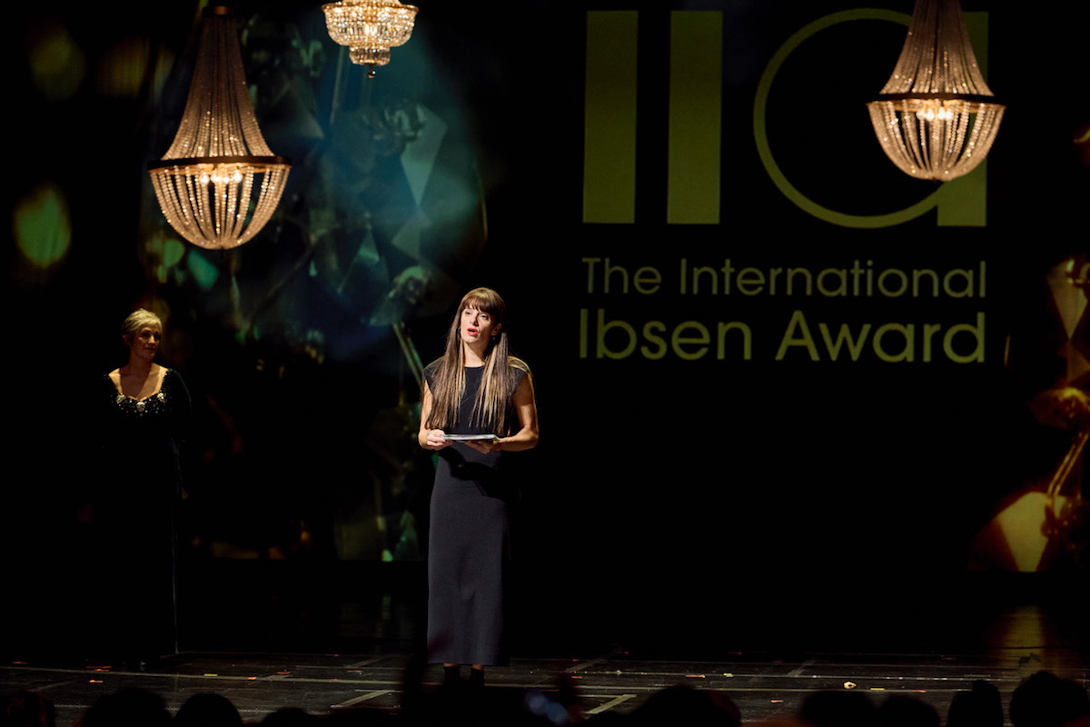 The prize was handed over by Ingrid Lorentzen, Chair of the IIA Committee and Artistic Director of the Norwegian National Ballet + Even Aleksander Hagen, State Secretary of the Ministry of Culture and Equality, Norway. © Ibsen Award 2024 | Rikke Løe Hovdal